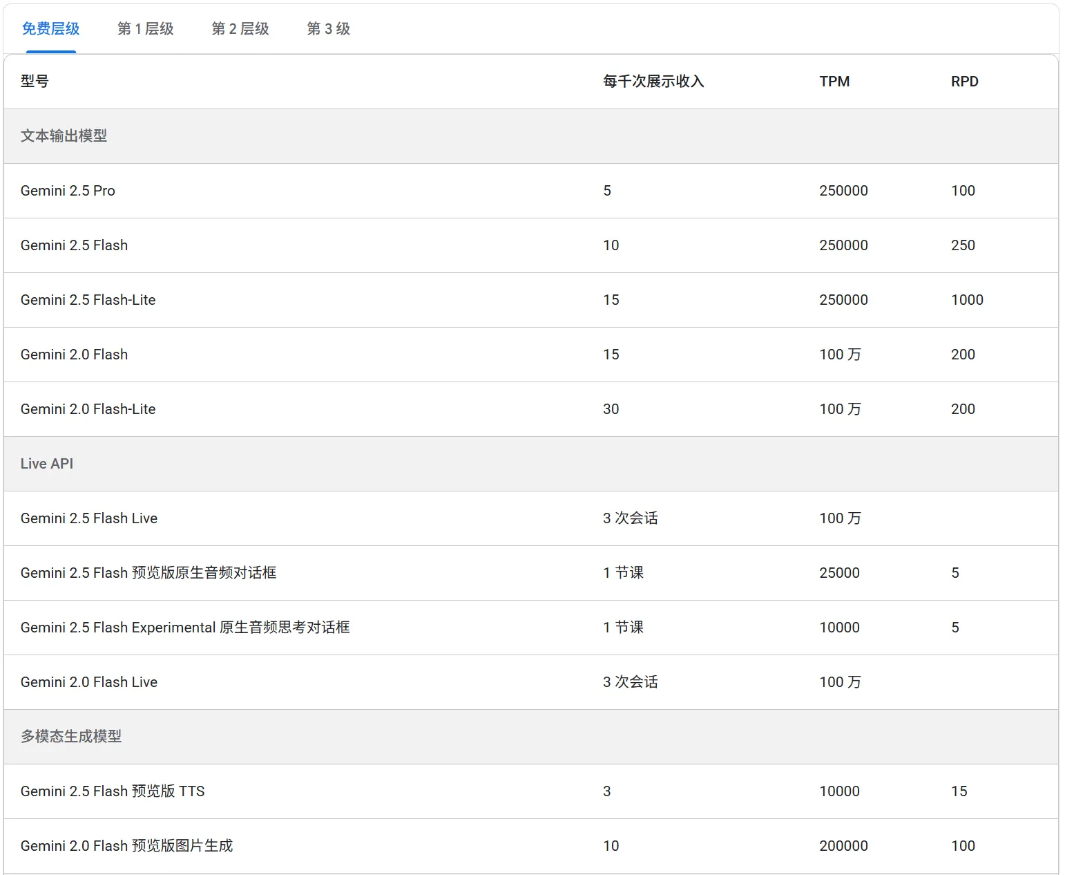 其中RPM指的是每分钟的最大请求次数,RPD指的是每天的最大请求次数。