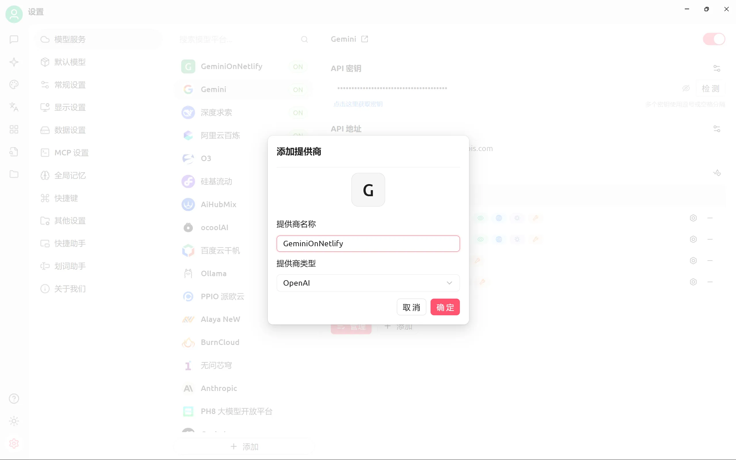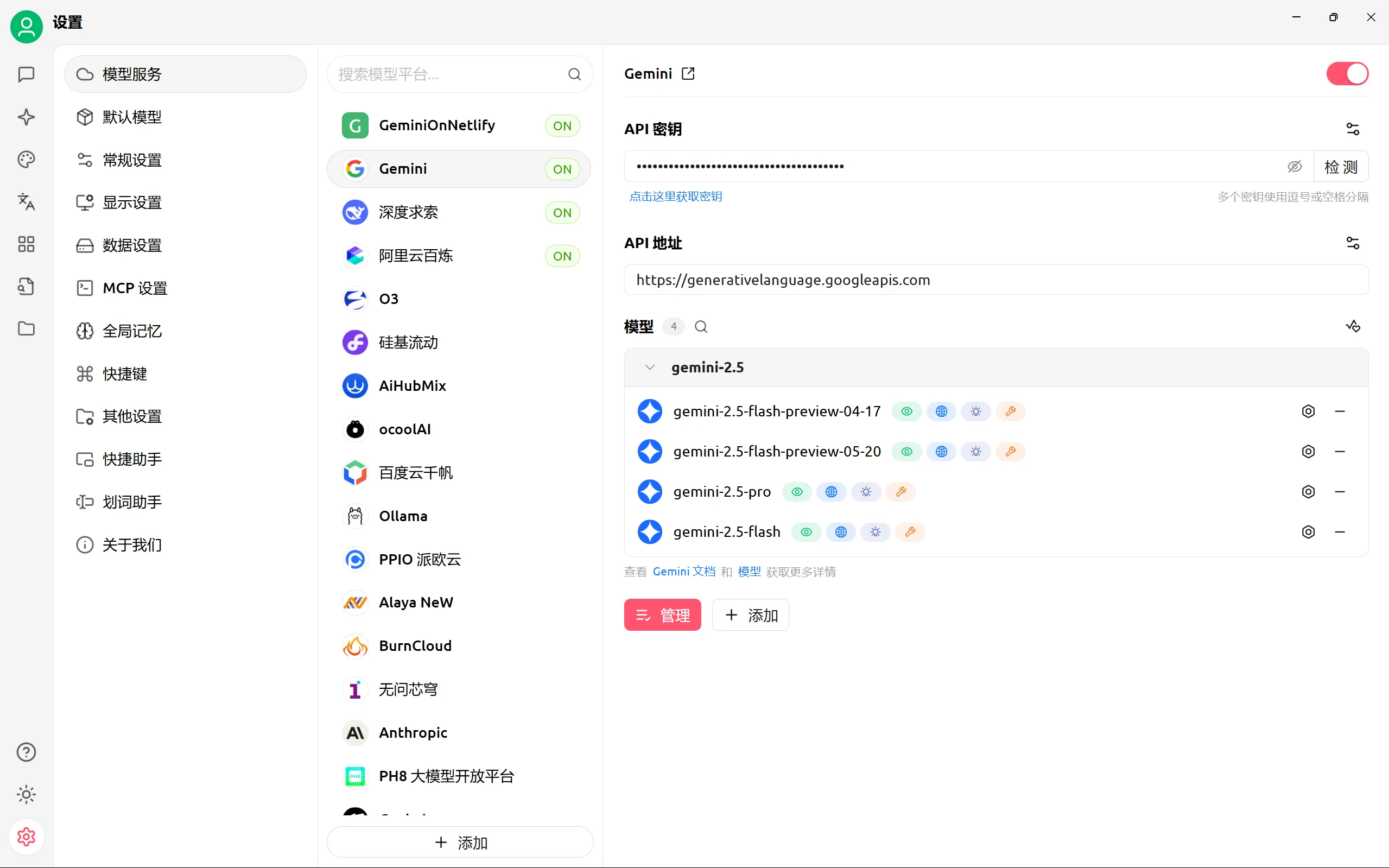 我们使用免费的AI客户端Cherry Studio,安装好后。点击左下角的设置来到模型服务,选择提供商Gemini,将刚刚复制的API密钥填写过来,然后添加模型,可以去之前的网页里查看可以免费使用的模型。添加完成后,回到聊天页面,选择模型,即可开始对话。