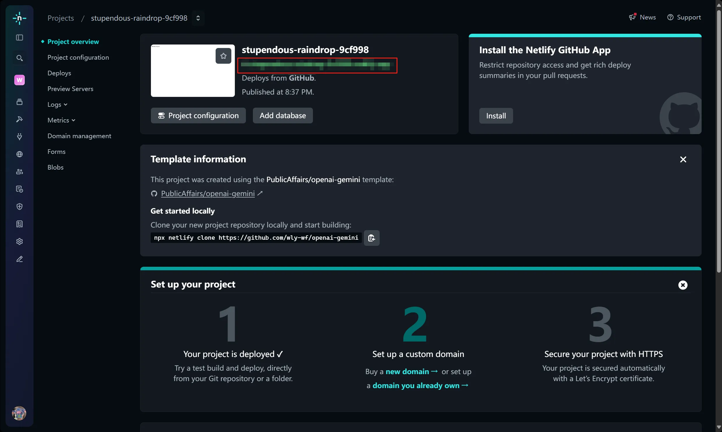 然后点击Connect to Github,登录自己的GitHub账户。随便起个名字点击save,等待部署完成。部署完成后,我们可以获得一个域名,这个域名在国内是可以直连的。