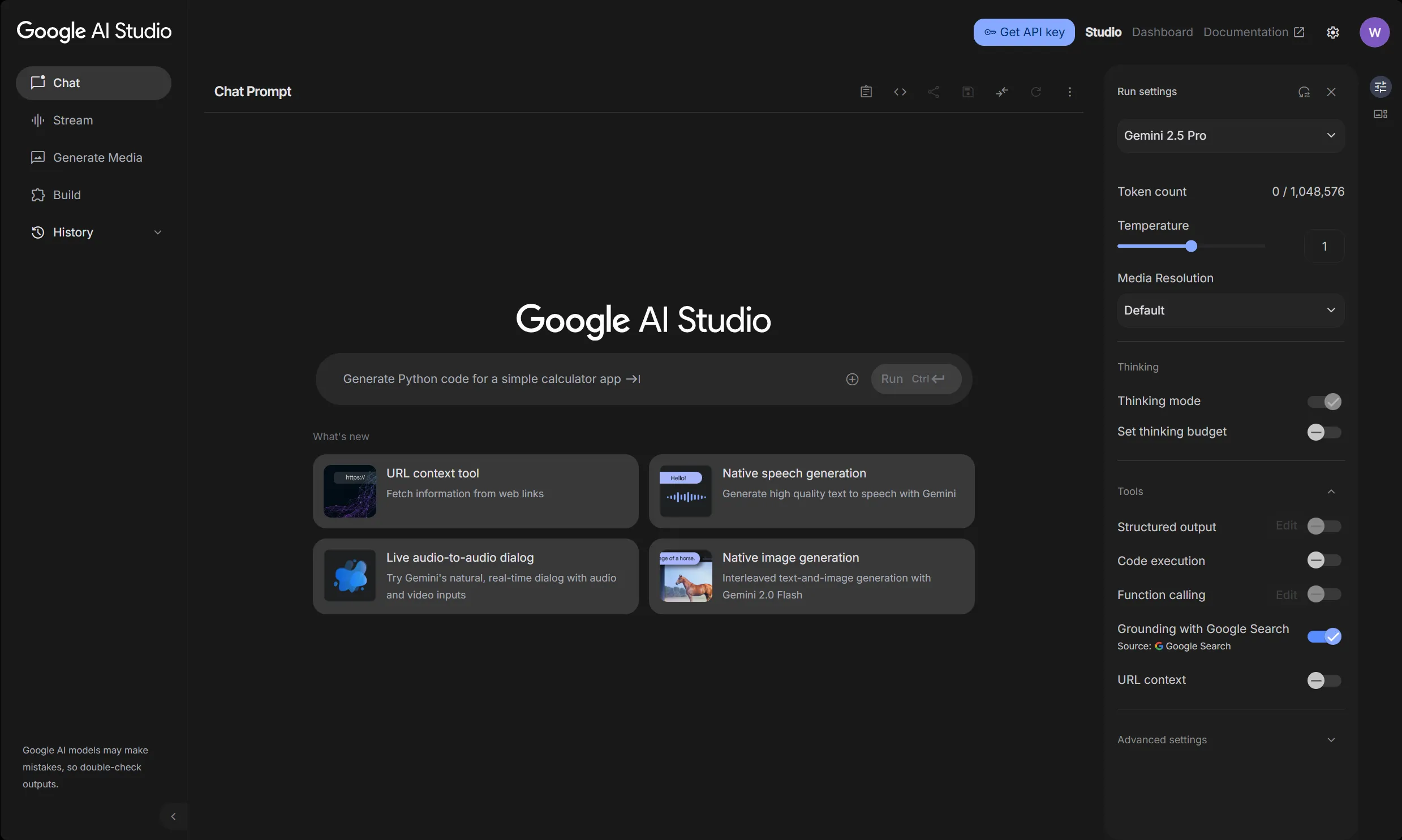 首先需要登录谷歌账号,界面右边可以选择大模型,可以免费使用Gemini 2.5 Pro,还可以设置一些参数。界面左边Stream是一个实时音视频对话,Generate Media是文生视频的功能,Build里面有一些代码案例,展示如何接入Gemini的API,做一些好玩有趣的应用,History可以保存一些常用的提示词。