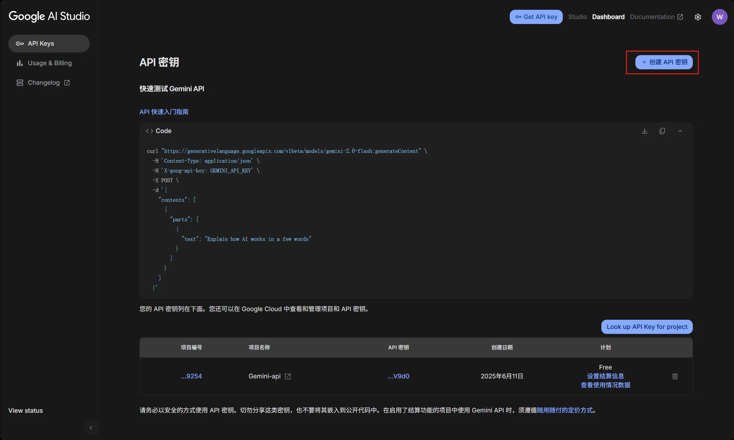 下面我们要获取API密钥。回到网站https://aistudio.google.com,点击右上角的Get API key,点击创建API密钥,随便选个项目点击创建,然后复制API密钥并保存好。