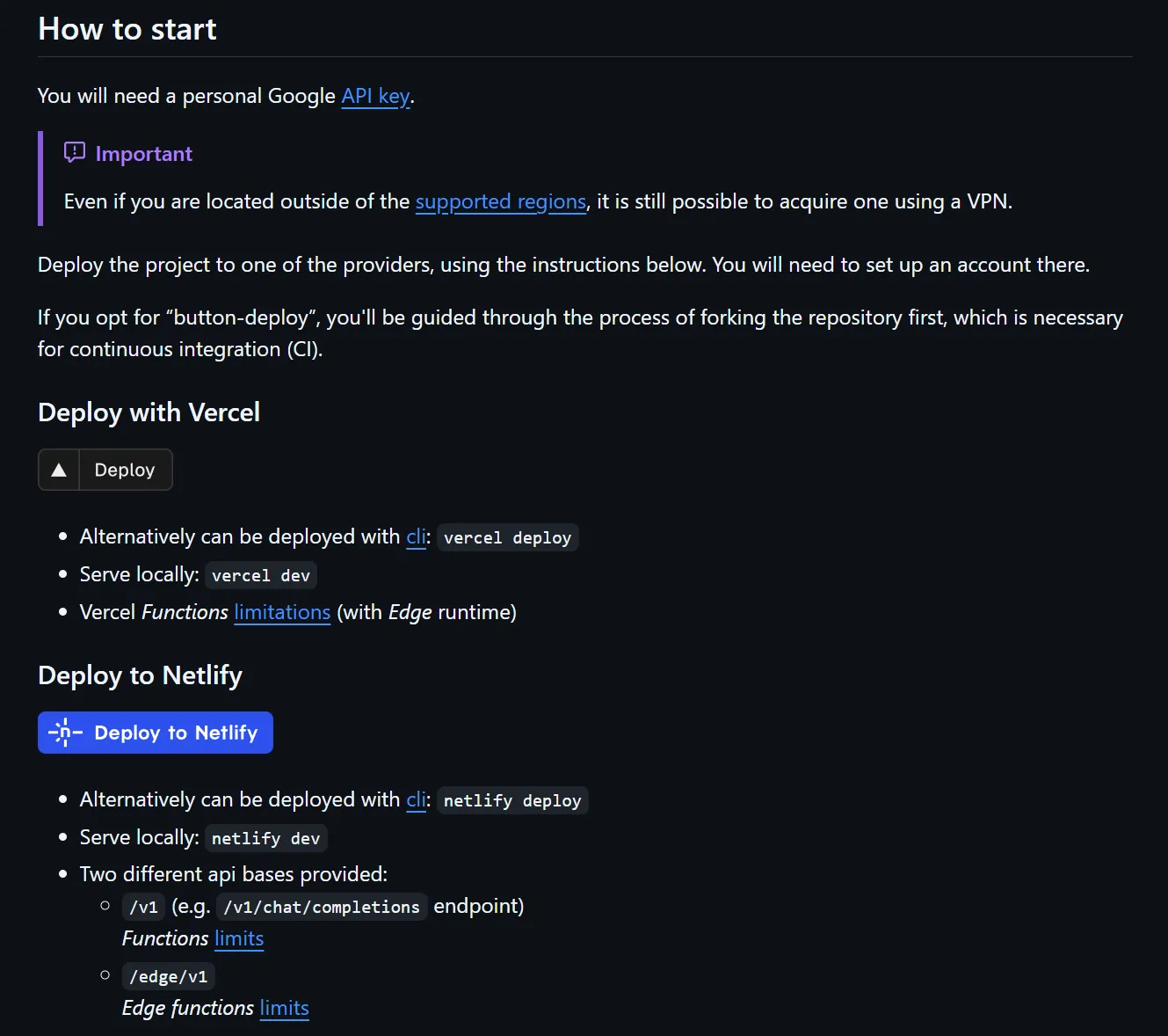 Gemini的API虽好,但是有一点不足的是它有地区限制,必须连着国外的上网环境才可以使用。我们可以自建一个免费的代理,把它的API中转到国内,在国内就可以免费使用了。下面使用GitHub开源项目openai-gemini实现这个功能。